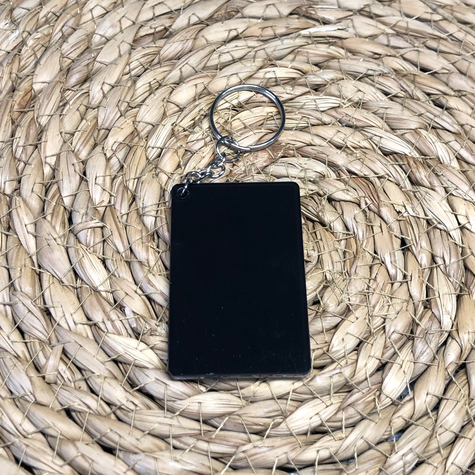 Este exclusivo llavero de metacrilato resistente mide 4cm x 6cm y está completamente pintado a mano.